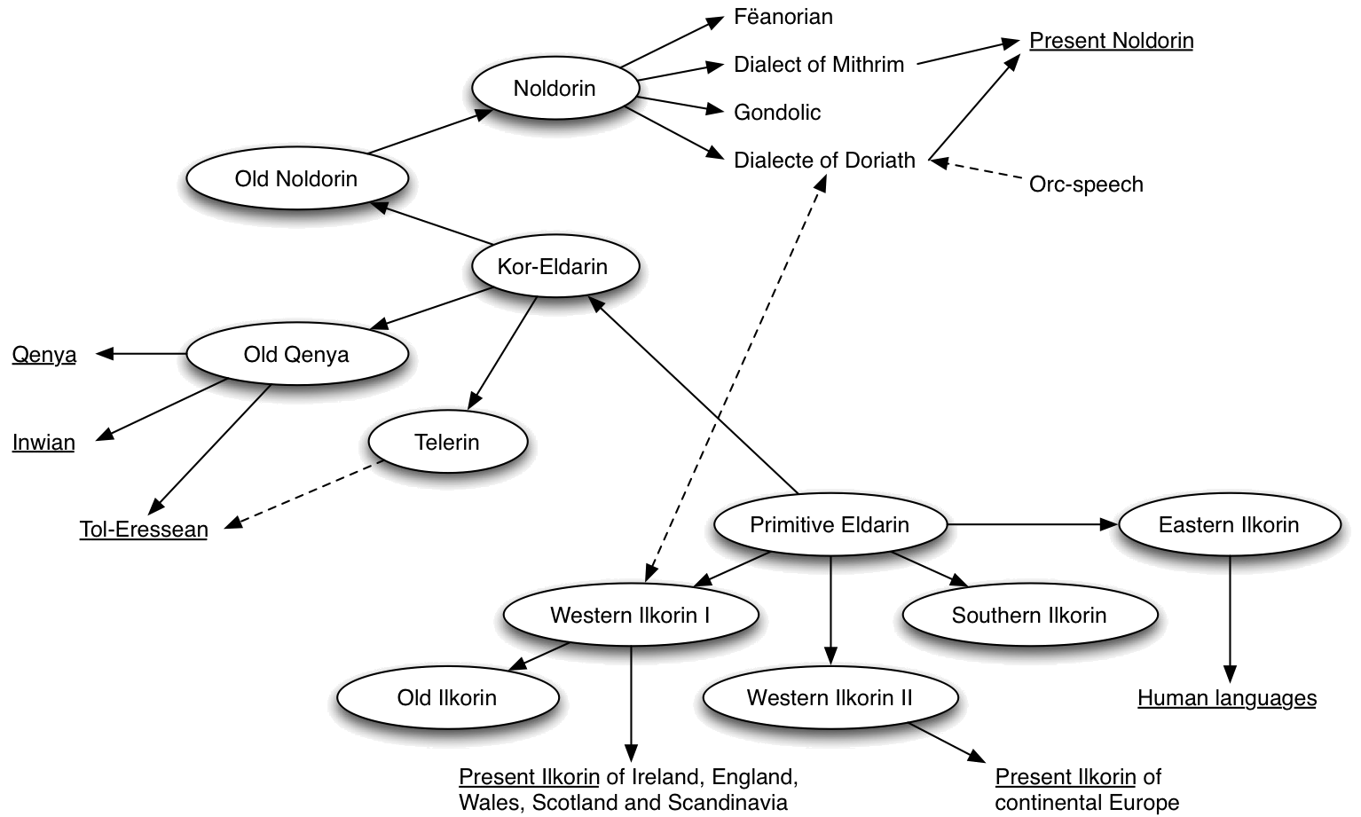 Kor-Eldarin yields Noldorin, Qenya and Telerin, the respective languages of the three Elvish tribes in Aman. Qenya and Inwian are not much different, the latter could be regarded as an elevated dialect (later Vanyarin Quenya). Tol-Eressean is spoken on the island of Tol-Eressea and derives from Old Qenya with influence of Telerin. A form of Telerin is also said to be spoken at the shores of England and Wales.