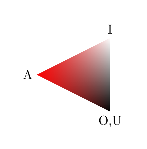 In the course of the 20th century a number of psychological experiments were carried out aiming to uncover correlations between sound and meaning. In 1929, Edward Sapir [2] offered a group of participants invented word pairs differing by one vowel only, like mil and mal, said to mean ’table’; or glupa and glopa, said to mean ’horse’. But one word of the pair was said to mean ’large table’, the other one ’small table’ (or ’horse’); and the participants were left to decide which was which. Sapir then gathered data about how large the particular vowels were perceived, which was later statistically evaluated by Newman who also performed a series of follow-up experiments [3]. It turns out that the subjects were very consistent in their judgements of the magnitude, in fact so consistent that Newman was able to assign a neat scale to the vowels. His results can be presented in a condensed form as follows: