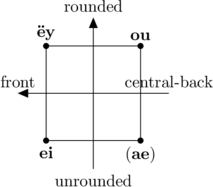 Hostorically, the mid long vowels [ε:, œ:, ɔ:] broke into ei, ëy, ou [εı̯, œy̯, ɔu̯], wherefore long variants of e, ë do not appear in the language, although long ō has been recreated by other changes. The diphthong ae [aæ̯]∼[ɑʌ̯] only appears in Moluma where it is the result of long [a:]∼[ɑ:].
